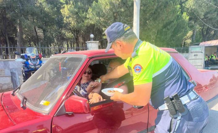 Bayram tedbirleri kapsamında gerçekleştirilen trafik denetiminde jandarma ekipleri, sürücülerin bayramlarını kutlayarak şeker ikram etti.