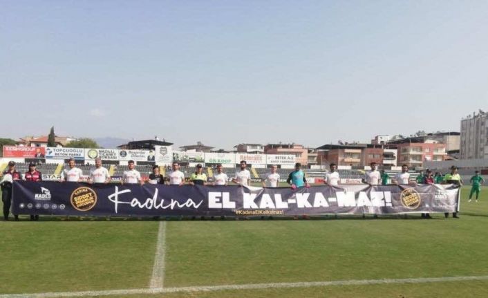 Aydın’ın Nazilli ilçesinde jandarma, kadına karşı şiddete dikkat çekmek amacıyla stadyumda, futbolcularla birlikte ’Kadına El Kalkamaz’ pankartı açtı.