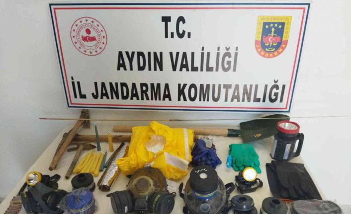 Yapılan aramada kaçak kazıda kullanılan 1 adet tulum, 1 adet kazma, 1 adet kürek, 3 adet gaz maskesi, 7 adet fitre, 2 adet el feneri, 2 adet kafa lambası, 7 çift iş eldiveni, 2 paket pil, 10 adet mum, 1 adet keser, 1 adet 2 metre kılavuz çubuğu, 1 adet murç, 1 adet demir kazı çapası ele geçirildi.