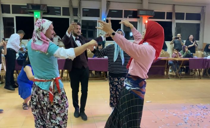 Kadıköy Mahallesi’ndeki belediye düğün salonunda gerçekleştirilen Nuri Can ve Rümeysa Akdağ çiftinin düğün törenleri ilginç anlara sahne oldu. Genç çiftin düğünlerini daha da eğlenceli kılmak isteyen çiftin arkadaşları yaptıkları sürpriz düğüne katılan davetlileri gülümsetti. Çiftin erkek arkadaşları üzerlerine giydikleri kadın kıyafetleri ile bir anda düğün salonunun kapısında belirdi. Neye uğradığını şaşıran çift, kapıdakilerin kendi arkadaşları olduğunu anlayınca kısa süreli şaşkınlık yaşadı. Damadı yanına çağırıp ortalarına alan arkadaşları daha sonra orkestranın çaldığı hareketli müzik ile pistin ortasına kadar geldi. Davetlilerin şaşkın bakışları içerisinde dakikalarca dünya evine giren dostları ile gönüllerince dakikalarca oynayan çiftin arkadaşları renkli görüntüler oluşturdu. Kadın kılığına giren erkeklerin oynadığı oyunlar davetlilere keyifli anlar yaşatırken, salonda bulunanlar o anları cep telefonları ile görüntülemek için adeta birbirleri ile yarıştı.