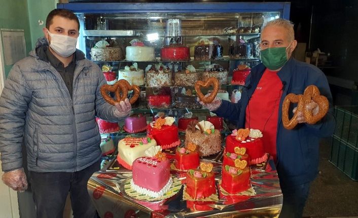 Aydın’ın Nazilli ilçesinde unlu mamuller üretimi yapan esnaf 14 Şubat Sevgililer Gününe özel yaptığı kalp şeklindeki simit ve pastalarla kalpleri fethetti.