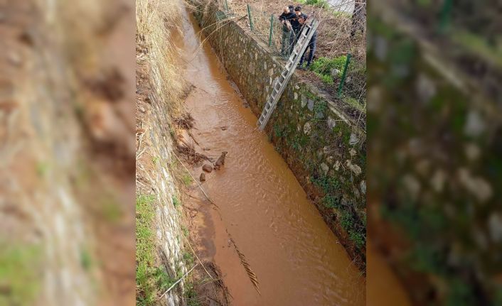 Aydın’ın Efeler ilçesinde sulama kanalına düşen köpeği Aydın Büyükşehir Belediyesi İtfaiye Daire Başkanlığı ekipleri kurtardı.