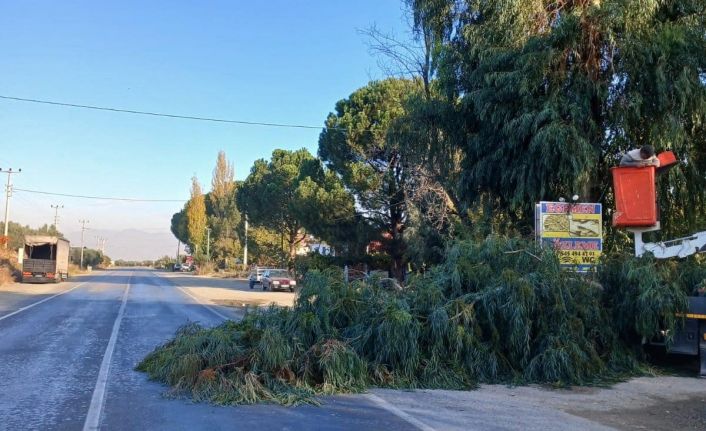 Aydın’ın Karacasu ilçesinde belediye ekiplerince seyir halindeki araçların görüşlerine engel olan ağaçların budaması yapılıyor.