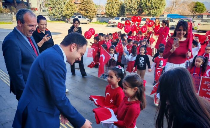 Aydın’ın Karpuzlu ilçesinde anaokulu öğrencileri, Türk bayrağına duydukları saygı ve sevgiyi sloganlarla dile getirerek Kaymakam Mustafa Bayram’a bayrak tesliminde bulundu.