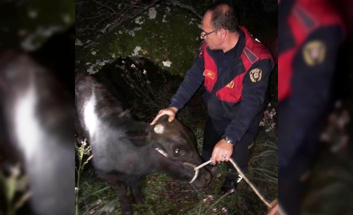 Aydın’ın Söke ilçesinde kayalık alanda sıkışan ineği itfaiye ekipleri kurtardı.