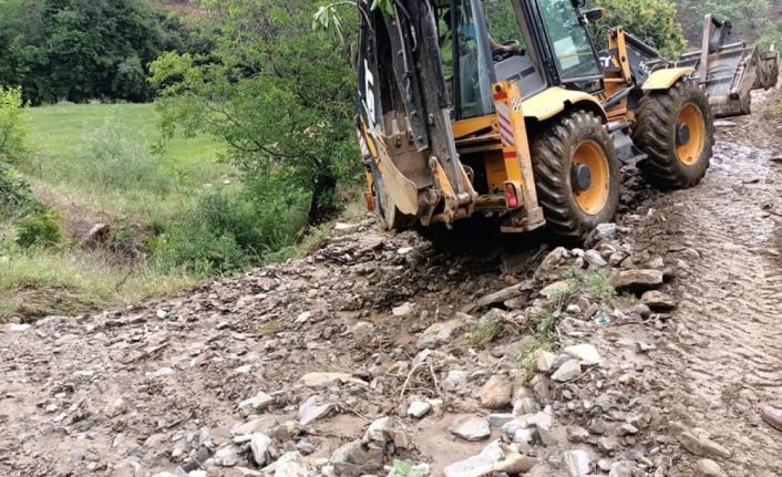 Aydın’ın Köşk ilçesinde de etkisini gösteren sağanak yağış sonrasında yağmur sularının sürüklediği kaya parçaları ve çamurla kapanan yolları açmak için Köşk Belediyesi ekiplerinin çalışmaları devam ediyor.