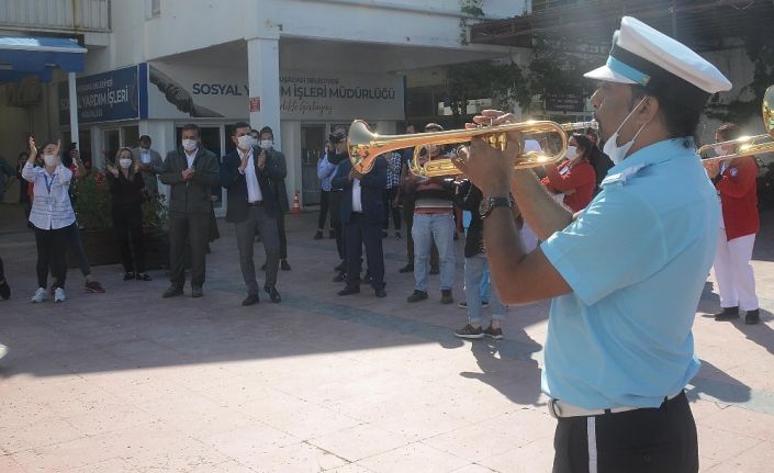 Kuşadası Belediyesi Bandosu, bu kez de 60 gündür mesai saati gözetmeksizin çalışan belediye personeli için moral konseri verdi.