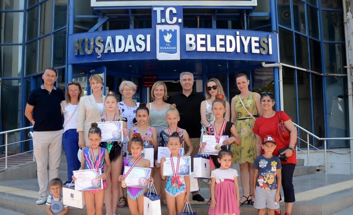 Başarılı jimnastikçiler Nil Ersoy (12), Afire Eva Akburu (11), Leysan Ada Yılmaz (10), Melina Yıkılmaz ( 10), Mila Tulum (8), Aylin Pat ( 8) ile Kayla Mira Yılmaz (7) aileleriyle birlikte Kuşadası Belediye Başkan Yardımcısı Oğuzhan Turan’ı makamında ziyaret etti. Başkan Yardımcısı Oğuzhan Turan, sporcuları tebrik ederek çeşitli hediyeler verdi.