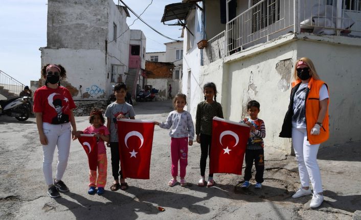 Kuşadası Belediyesi Sosyal Yardım İşleri Müdürlüğü ekipleri, Ramazan ayı nedeniyle gıda yardımı paketi dağıtımına 23 Nisan Ulusal Egemenlik ve Çocuk Bayramı’nda da devam etti. Çalışmalarını Hacıfeyzullah Mahallesi Tepe Sokak’ta sürdüren ekipler, gıda paketlerinin yanında çocuklara Türk Bayrağı hediye ederek bayramlarını kutladı. Pandemi kısıtlamaları nedeniyle bayramı evlerinde geçiren çocuklar, balkon ve camlarını Kuşadası Belediyesi’nin armağan ettiği Türk bayrakları ile donattı.