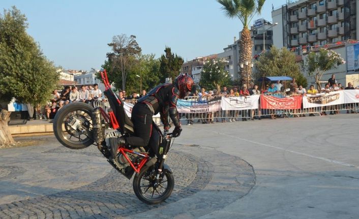 Motosiklet akrobasi takımı tarafından Kuşadası sahil bulvarında 3 gün sürecek şovun ilki bugün yapıldı. El heykeli olarak da isimlendirilen alanda yapılan gösteriyi vatandaşlar büyük bir ilgi ile izledi. Türkiye’nin motosiklet akrobasisi dalında tanınmış isimlerinden Furkan Hancar ve Hakan Can Namlı izleyenlere unutulmaz anlar yaşattı.