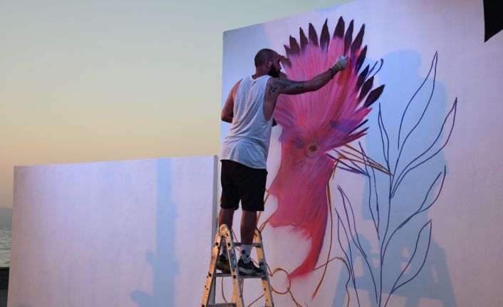 Ada Modern Sanat Galerisi’ndeki illüstratörler sergisinde de eseri bulunan Devak mahlaslı sanatçı, Atatürk Meydanı’na kurulan 2 dev tuvale kuş figürleri ile Kuşadası’na özgü bitki türlerinden oluşacak eserini çizmeye başladı.