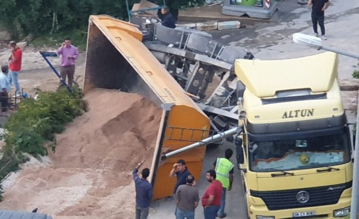 Kuşadası’nda bir inşaata kum taşıyan damperli tır, sürücüsünün direksiyon hakimiyetini kaybetmesi sonucu devrildi.