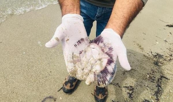 Aydın’ın Kuşadası ilçesinde sahile mor renkli ölü denizanaları vurdu.