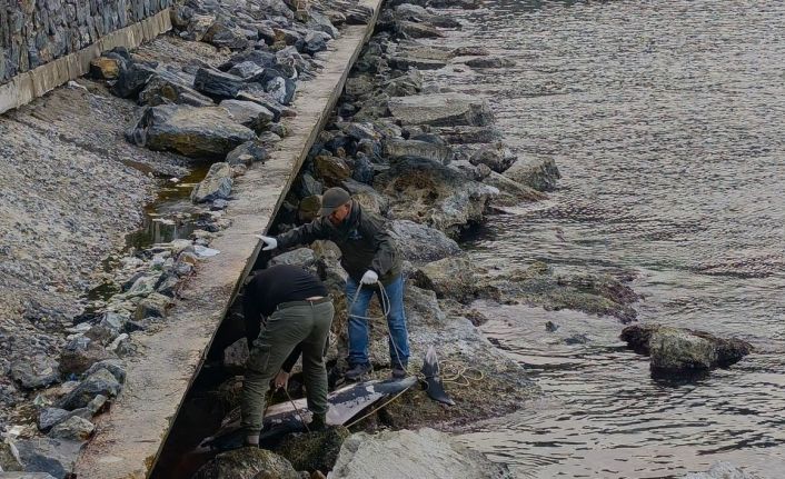 Kuşadası’nda ölü yunus balığı kayalıklara vurdu