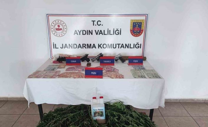 Aydın İl Jandarma Komutanlığı, Kaçakçılık ve Organize Şube Müdürlüğü ekipleri uyuşturucu madde imal ve ticaretini yapan şahıslara yönelik çalışmalarına aralıksız devam ediyor. Edinilen bilgiye göre ekipler, Kuşadası ilçesi Değirmendere Mahallesi’nde S.A. ve M.Ü. isimli 2 şahsa ait bir adreste uyuşturucu ticareti yapıldığını tespit etti. Harekete geçen ekipler, belirlenen adrese düzenlediği baskında S.A. isimli şüpheliyi yakalarken, M.Ü. isimli diğer şüpheli hakkında yakalama çalışması başlattı. İkamette yapılan aramada ise 40 bin 180 TL sahte para, 320 gram kubar esrar, 43 kök kenevir bitkisi, 3,5 litre kenevir sıvı gübresi, 1 adet esrar öğütme aparatı, 2 adet ruhsatsız tabanca, 1 adet kurusıkı tabanca, 109 adet mühimmat ele geçirildi. Şüpheliler hakkında adli işlem başlatıldı.