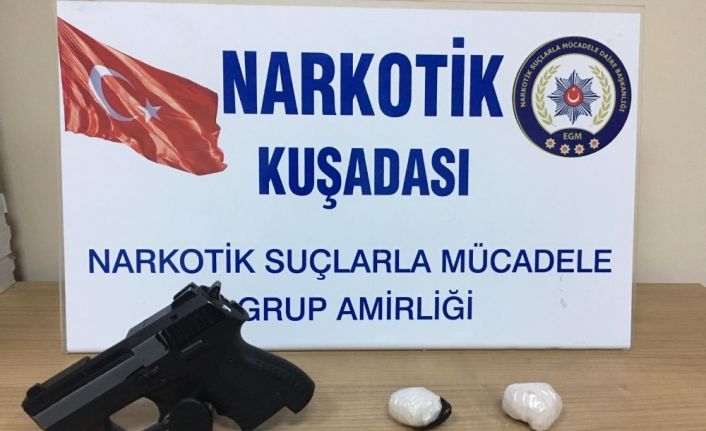 Edinilen bilgiye göre, bir ihbarı değerlendiren Kuşadası Emniyet Müdürlüğü Narkotik Suçlarla Mücadele Grup Amirliği ekipleri, takip ettikleri ve içinde iki şüpheli olan bir aracı Davutlar Yolu’nda durdurdu. Araçta bulunan M.K. ve H.U. isimli şüphelileri araçtan indiren narkotik ekipleri, yaptıkları üst aramasında M.K.’nin üzerinde suç unsuruna rastlamazken, H.U. isimli şüphelinin üzerinden marka model ibaresi bulunmayan 7,65 mm çapında ruhsatsız tabanca, 1 adet şarjör, 4 Adet Fişek, 20,26 gram kristal olarak tabir edilen metamfetamin uyuşturucu madde ele geçirildi.