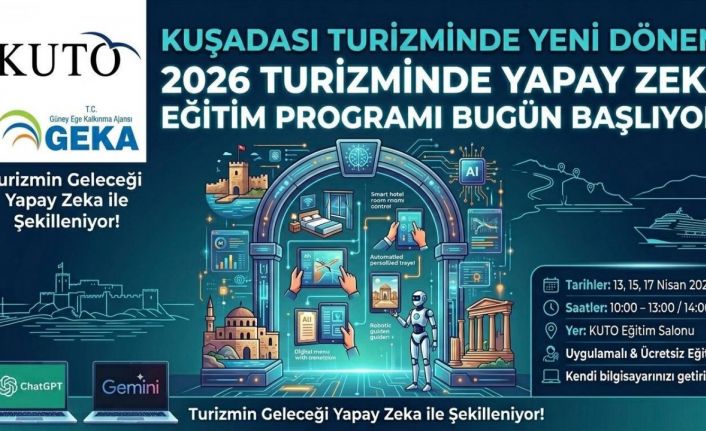 Kuşadası Ticaret Odası (KUTO) ve Güney Ege Kalkınma Ajansı (GEKA) iş birliğiyle düzenlenen "2026 Turizminde Yapay Zeka Eğitim Programı" bugün kapılarını açıyor. Turizm sektörünü dijital geleceğe hazırlamayı hedefleyen program, Kuşadası Ticaret Odası Eğitim Salonu’nda gerçekleştirilecek.