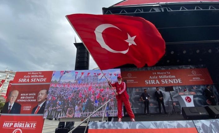 Genel seçimlere sayılı günler kala Aydın’a gelen Milliyetçi Hareket Partisi (MHP) Genel Başkanı Devlet Bahçeli için vatandaşlar, Atatürk Kent Meydanı’nda toplandı. Bahçeli’nin mitingi öncesinde MHP’nin sembol isimlerinden olan ve “Bayrak Dede” lakabıyla tanınan Beyler Virdiloğlu, elinde taşıdığı Türk bayrağı ile vatandaşları coşturdu.