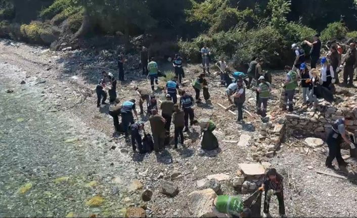 Aydın’ın Kuşadası ilçesinde bulunan Milli Park’ta kıyı temizliği gerçekleştirilirken, koyların temizlendiği çalışmalar sonunda 4 römork atık toplandı.