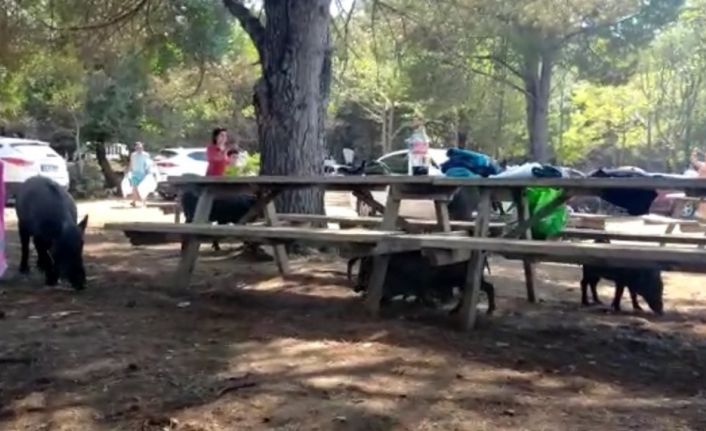 Aydın’ın Kuşadası ilçesindeki Dilek Yarımadası Büyük Menderes Deltası Milli Parkı’nda yaban domuzları tatilcilerin arasında gezmeye başladı. İnsanların piknik yaptığı alanda masalar arasında dolaşıp yiyecek arayan yaban domuzu sürüsü bazılarını korkuturken bazılarının ilgisini çekiyor.