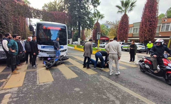 Aydın’ın Efeler ilçesinde yola çıkan yayaya çarpmamak için direksiyonu kıran motosiklet sürücüsü, halk otobüsü ile çarpışarak yaralandı.