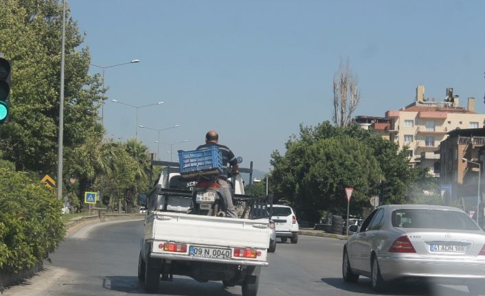 Aydın İzmir kara yolunda bir motosiklet sürücüsünün motoruyla kamyonetin üzerinde yolculuk yapması görenleri şaşırttı.