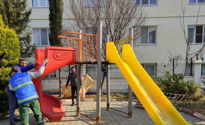 Nazilli Belediyesi Park ve Bahçeler Müdürlüğü ekipleri, deprem bölgesinden gelerek yurda yerleştirilen depremzedelerin çocukları için Gevherhan Sultan Kredi Yurtlar Kurumu Öğrenci Yurdunda oyun parkı oluşturuyor.