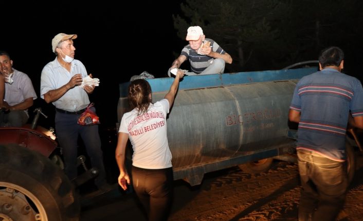 Ülke genelinde çıkan yangınlarda söndürme çalışmalarına destek veren ve bölgede görevli ekiplerin ihtiyaçlarını temin eden Nazilli Belediyesi, kendi işletmesi olan Tepe Kafe’de hazırlanan kumanyaları akşam saatlerinde görevlilere teslim etti.