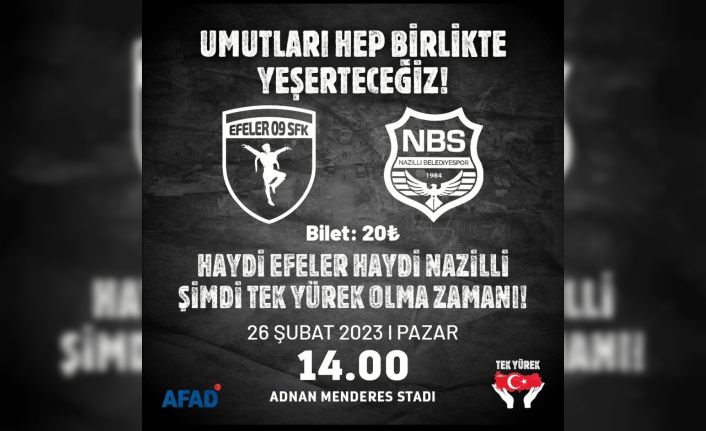 Eşin Group Nazilli Belediyespor ve Efeler 09 SFK’nın yardım maçı 26 Şubat Pazar günü saat 14.00’da Aydın Adnan Menderes Stadyumu’nda oynanacak. Karşılaşmadan elde edilen tüm gelirler AFAD’a bağışlanacak.