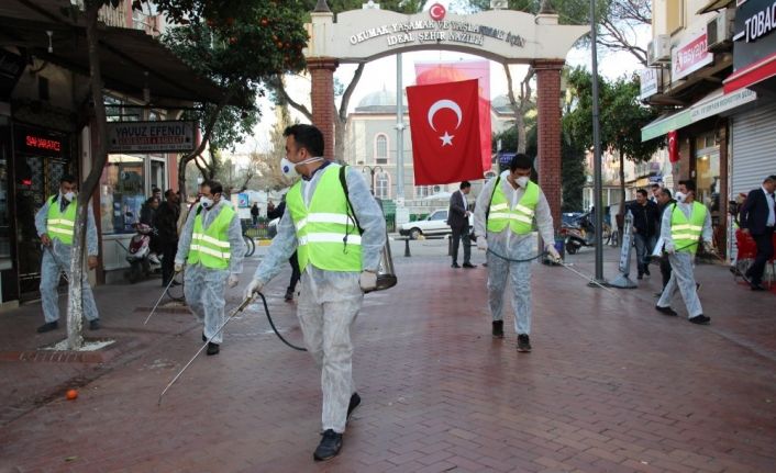 İlk olarak Koca Cami’de çalışmalara başlayan ekipler, Uzun Çarşı, alt geçit, tren garı ve kamuya açık alanları özel makinelerle dezenfekte etti.