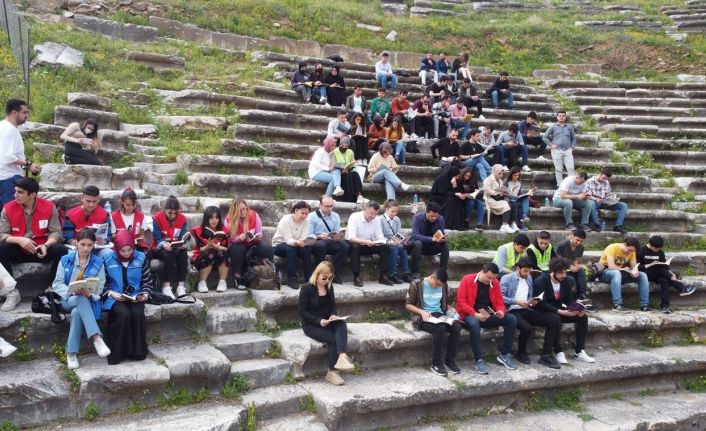 Aydın’da İl Kültür Müdürlüğü öncülüğünde farklı bir kitap okuma etkinliği düzenlendi. İzmir’in Selçuk ilçesinde bulunan Efes Antik kenti ile birlikte Anadolu’da ayakta kalmış en iyi 2 kütüphaneden birine ev sahipliği yapan Aydın Sultanhisar’daki Nysa Antik Kenti, kitap kurtlarını ağırladı. Önce antik kenti rehberler eşliğinde gezerek kent hakkında ve kentteki antik kütüphane hakkında bilgiler alan öğrenciler daha sonra antik kentin en önemli yeri olan Anfi Tiyatro’da hep birlikte kitap okudu. Yaklaşık 45 dakika süren kitap okuma etkinliği havanın da güzel olması ile birlikte renkli görüntülere sahne oldu.