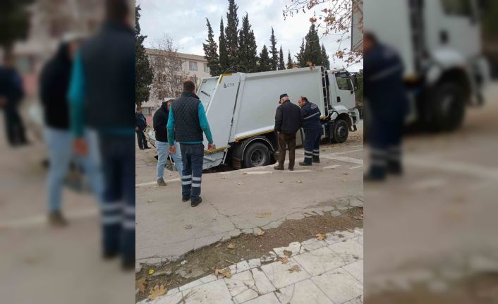 Aydın İmam Hatip Lisesi bahçesine çöp toplamak için giren belediye çöp kamyonu beton basketbol sahasının çökmesi üzerine oluşan çukara düştü.