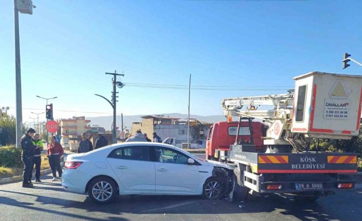 Aydın’ın Köşk ilçesinde meydana gelen trafik kazasında otomobil kamyonete ok gibi saplanırken, kazada her iki araçta da maddi hasar meydana geldi.