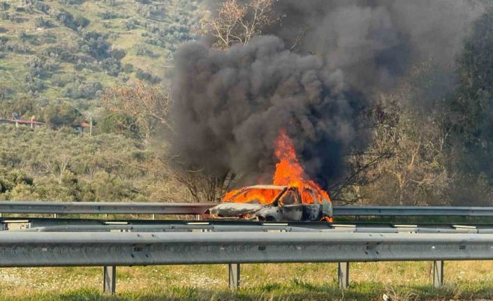 Aydın’ın Germencik ilçesinde seyir halindeyken alevlere teslim olan otomobil hurdaya döndü.
