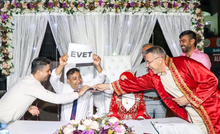 Başkan Güler, sosyal medya hesabı üzerinden de yaptığı paylaşıma ise “Bir kez daha gördük ki sevginin aşamayacağı engel yoktur. Pınar Dönmez ve Zafer Çetin kardeşlerimizin nikah merasimlerini gerçekleştirdik, bu mutlu günlerine ortak olduk. Yeni çiftimizi gönülden kutluyor, iki cihan saadeti diliyorum” notunu düştü.