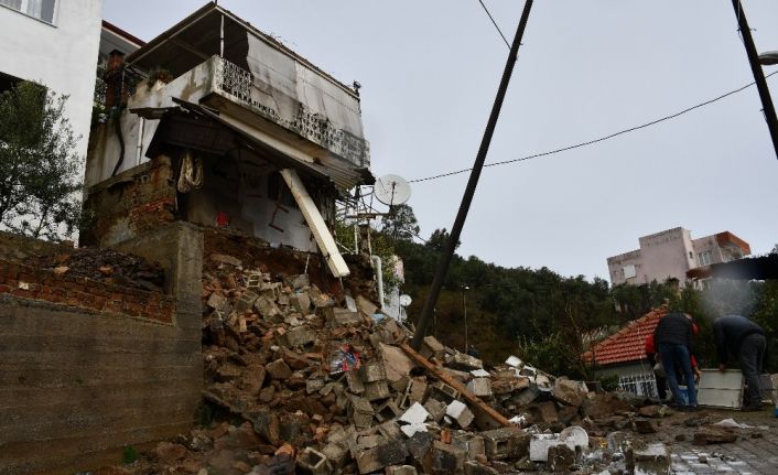 Aydın’ın Söke ilçesinde aşırı yağış ile istinat duvarı göçmesi ile meydana gelen toprak kayması sonucu bir ev askıda kalarak yıkılma tehlikesi geçirdi.