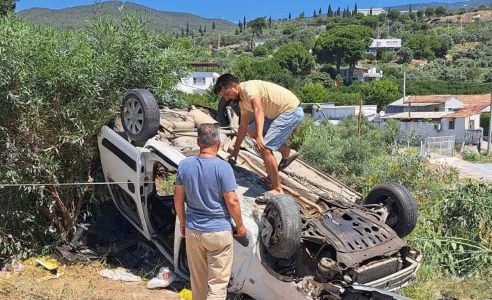 Aydın’ın Söke ilçesi Kuşadası yolu Yamaç mevkiinde meydana gelen trafik kazasında, virajı alamayan araç şarampole yuvarlanarak takla attı.