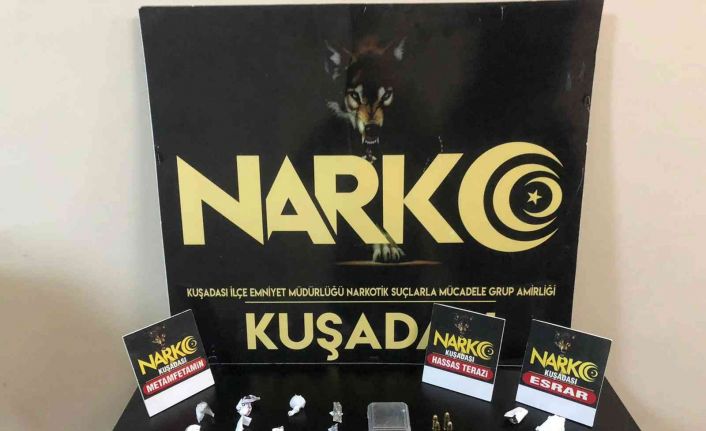 Aydın’ın Kuşadası ilçesinde şüphe üzerine durdurulan araçtan mermi, uyuşturucu ve hassas terazi çıktı. Operasyon sonrası iki kişi gözaltına alındı.