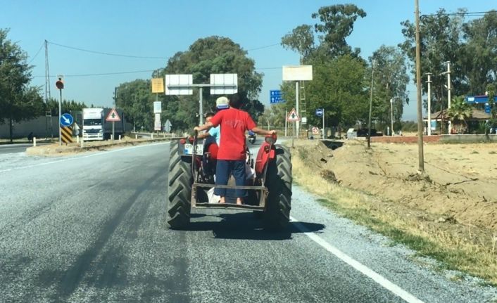 Efeler ilçesi ile kırsal mahalleleri birbirine bağlayan yolda yanından geçen birçok araca ve geçmişte yaşanan benzer kazalara aldırış etmeden traktörün arkasına bağlanan demir kasada ayakta yolculuk yapan çocuklar herkesi şaşkına çevirdi. Çocuklar traktörün zaman zaman yolda tümseklere girmesiyle düşme tehlikesi yaşarken, tehlikeli yolculuk amatör kamera tarafından anbean kaydedildi. Ölümle burun buruna yolculuk yapan çocukları görenler, traktör sürücüsü ebeveynlerine ise tepki gösterdi. Dakikalarca süren yolculuk traktörün akaryakıt istasyonuna girmesi ile son buldu.