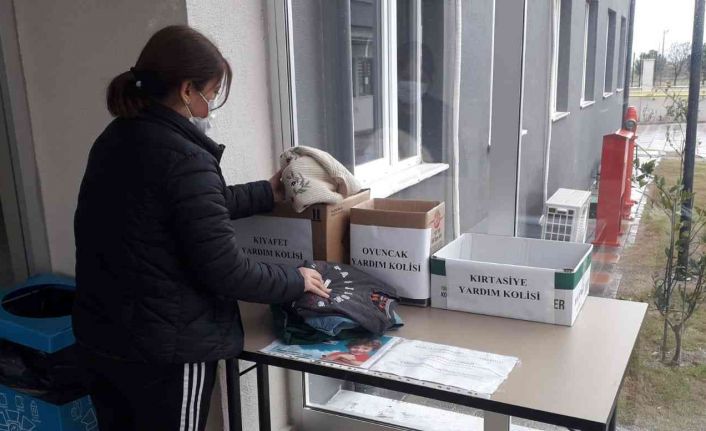 Aydın’ın Efeler ilçesinde bulunan Güzelhisar Öğrenci Yurdu’nda kalan gönüllü gençler topladıkları kıyafet, oyuncak ve kırtasiye malzemelerini ihtiyaç sahibi aileler için paketliyor.