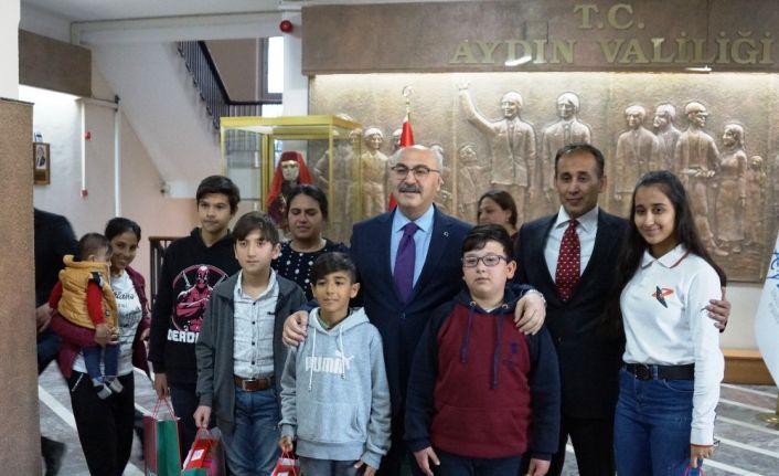 Bayrağa saygı gösteren çocukları aileleri ile birlikte makamında kabul eden Aydın Valisi Yavuz Selim Köşger, çocuklara hediye takdim etti.