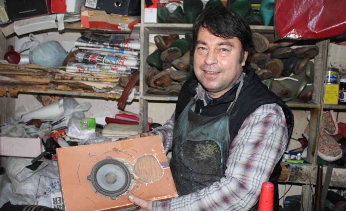 Aydın’da çırak olarak geldiği atölyede usta olarak devam eden 46 yaşındaki ayakkabı tamir ustası Murat Yardım, 4 metrekarelik atölyesinde mesleğini ilk günkü heyecan ile sürdürüyor. Gününün çoğunu küçük dükkanında geçiren ve vakit geçirmek için müzik dinleyen Yardım’ın, kullanılmayan ayakkabı kutusundan yaptığı hoparlörü ise gelen müşterilerinin dikkatini çekiyor. İşi gereği elinde bulunan fazla ayakkabı kutularını da bir şekilde değerlendirdiğini ifade eden Yardım; “Yeni hoparlör almak istesem maliyetli olacaktı. Elimde önceden kalan araba hoparlöründen vardı. Buna da sanayiye gidip kabin yaptırmam gerekiyordum. Ne yapabilirim diye düşündüm. İşim gereği dükkanımda çok fazla ayakkabı kutusu var be bunlardan kabin yapabileceğimi düşündüm. ayakkabı kutusunun kapağının ortasını delip içine hoparlörü oturttum. Hoparlörü normal bir şekilde kullanmaya kalktığımda tiz sesleri daha çok veriyordu. Ses düzgün gelmiyordu. Şimdi ise tok bir ses gelmeye başladı. Kabin yaptırmakla uğraşmadım kendim elimdeki imkanları değerlendirerek daha pratik çözüm buldum ve kendi hoparlörümü yaptım. Baya iyi ses de veriyor” dedi.