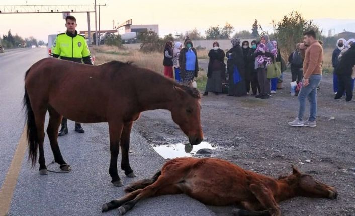 Aydın-Denizli Karayolu üzerinde meydana gelen kazada aracın çarptığı tay telef olurken, anne atın dakikalarca yavrusunun başından ayrılmaması vatandaşları duygulandırdı.
