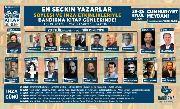Kitap severlerin sabırsızlıkla beklediği geçtiğimiz yıl pandemi nedeniyle gerçekleştirilemeyen 3. Bandırma Kitap Günleri, bu yıl 20-26 Eylül 2021 tarihleri arasında yine Bandırma Cumhuriyet Meydanı’nda gerçekleştiriliyor.