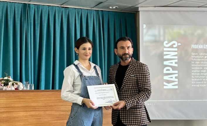 Ayrıca proje kapsamında atalık tohum ve fide üreticisi Eda Girgin, fakültemize davet edilirken, öğrencilerle bir araya geldi. Eda Girgin, etkinlikte yaptığı konuşmada, atalık tohumların tarihi ve kültürel önemine vurgu yaptı. Etkinlikte, tohumların genetik mirasının korunması, bu süreçte karşılaşılan zorluklar ve çözüm önerileri gibi konuları ele alan Girgin ayrıca, sürdürülebilir tarım ve organik üretim konularında da öğrencileri bilgilendirdi. Özellikle yerel üretimin teşvik edilmesi gerektiğine dikkat çekerek, atalık tohumların modern tarımdaki yerini ve avantajlarını örneklerle açıkladı. Çok sayıda öğrencinin katılım gösterdiği etkinlik, karşılıklı soru-cevap bölümüyle devam etti. Fakülte bünyesinde düzenlenen bu etkinlik toplumsal sorumluluk bilinci anlamında farkındalık oluştururken, atalık tohumların korunması ve sürdürülebilir tarımın desteklenmesi yönünde güçlü bir mesaj verdi. Gerçekleştirilen etkinlik sayesinde atalık tohumların önemini daha iyi anladıklarını ifade eden öğrenciler, takım çalışması dersinin kendilerine sağladığı faydalardan da bahsederek, bu derste kazandıkları iş birliği, iletişim ve problem çözme becerilerinin gerçek hayatta nasıl uygulanabileceğini görme fırsatı bulduklarını belirtti. Ayrıca, takım çalışması sürecinde farklı bakış açıları geliştirme, birlikte çalışma ve ortak hedefler doğrultusunda hareket etme yeteneklerini güçlendirdiklerini vurguladılar. Bu deneyimlerin, iş hayatlarında onlara büyük katkı sağlayacağına inandıklarını ifade ettiler. Etkinlik sonunda Fakülte Dekanı Prof. Dr. M. Oğuzhan İlban, Eda Girgin’e katkılarından dolayı teşekkür belgesini takdim etti. İlban, yaptığı konuşmada, yerel üreticilerle öğrencileri bir araya getirmenin, tarım sektörüne olan ilgiyi artırma ve gençleri bilinçlendirme adına son derece önemli olduğunun altını çizdi. Son olarak Eda Girgin, kendi çiftliğinden getirdiği atalık tohumları öğrencilere dağıttı.
