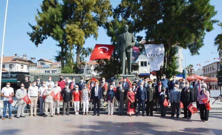 Ayvalık Cumhuriyet Meydanı’nda saat 10.30’da başlayan törene; Ayvalık Kaymakam vekili Akgün Corav, Ayvalık Garnizon Komutanı Personel Albay Ertan Tutar, Ayvalık Belediye Başkanı Mesut Ergin’in yanı sıra, siyasi partilerin temsilcileri, belediye başkan yardımcıları, belediye meclis üyeleri, oda başkanları, daire amirleri, gaziler ve çok sayıda vatandaş katıldı.