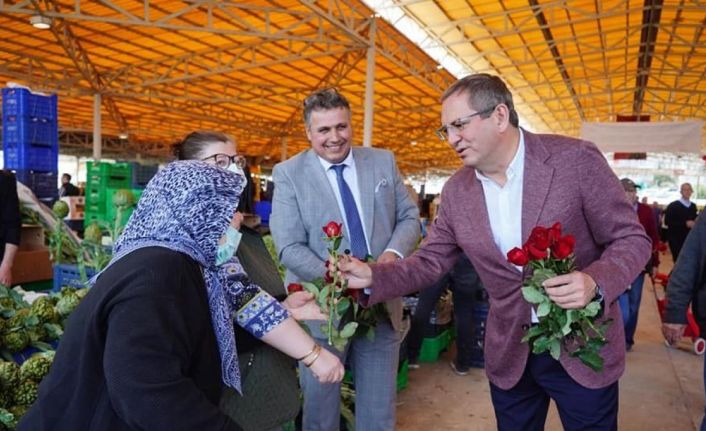 Balıkesir’in Ayvalık ilçesinde, Anneler Günü nedeniyle Ayvalık Sebze ve Meyveciler, pazar günü kurulan Armutçuk semt pazarında alışveriş yapan annelere kırmızı güller dağıtarak nazik bir jest yaptı.