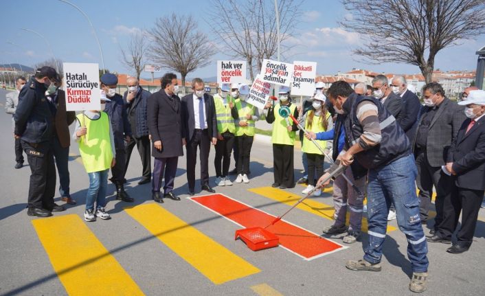 Yolda kırmızıçizgiyi çeken Ayvalık Kaymakamı Görgülüarslan, “Tüm kurum amirlerimizle bugün bir farkındalık oluşturmak için buradayız. Önceliğimiz yaya. Bakanlığımızın bu konuda hassasiyetleri var. Farkındalık oluşturmak için burada bu etkinliği düzenledik. Asla unutulmasın, yaya şeritleri kırmızı çizgimizdir.” dedi.