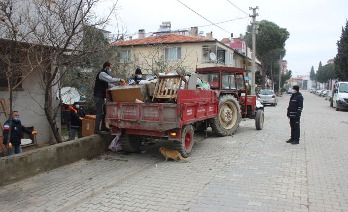 Balıkesir’in Burhaniye Belediyesi Hacı Ahmet Mahallesi’nde bulunan apartmanın bahçesinden iki traktör çöp temizledi.