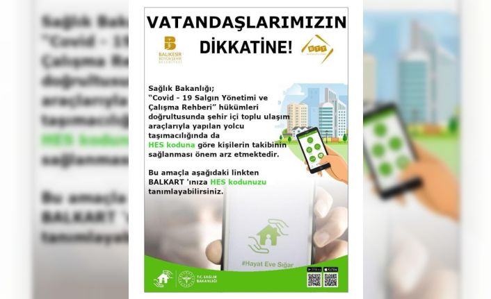 Balıkesir Büyükşehir Belediyesinden yapılan açıklamada şu ifadelere yer verildi. "Toplu taşıma araçlarından faydalanan vatandaşlar Vatandaşlarımızın https://www.akillibiletim.com/HesMatch.aspx?cid=10 adresinden HES(Hayat Eve Sığar) kayıt formunu doldurarak, Akıllı Balkartını entegre etmeleri rica olunur" açıklaması yapıldı.